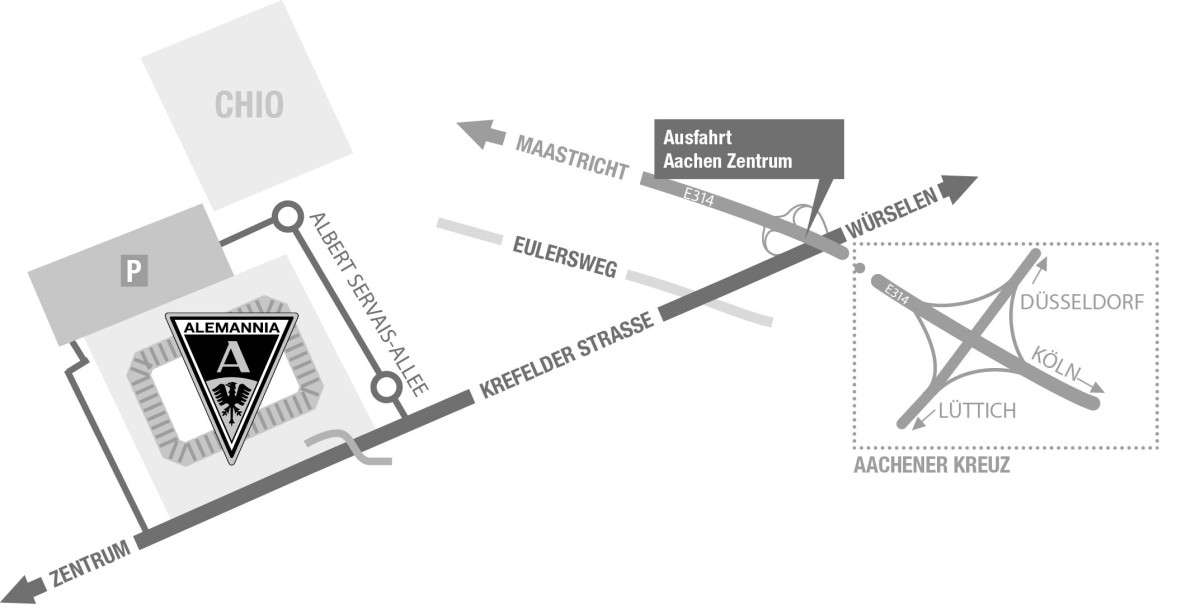 Der Gästeparkplatz ist wie folgt zu erreichen: Nach Abfahrt Autobahn Aachen Zentrum an der Kreuzung rechts abbiegen in den Eulersweg. Dann die zweite Möglichkeit links in den Soerser Weg. Hinter dem Reitstadion wieder links rein (Straße „Am Sportpark Soers“). Die Straße „Am Sportpark Soers“ ist relativ neu und wird entsprechend nicht von allen Navigationsgeräten erkannt.